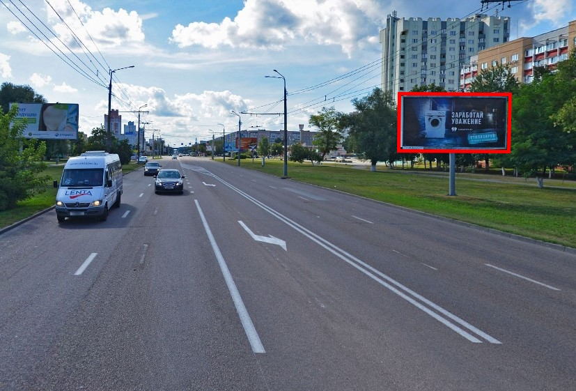 Билборд установлен на одной из центральных улиц Гомеля — пр-т Речицкий. Сторона Б просматривается по ходу движения в сторону ТРЦ «Мандарин-Плаза». Здесь всегда интенсивный поток транспорта и пешеходов.