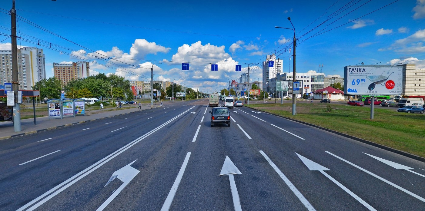 бизнес центр «Epam», образовательный центр IT-Academy, автосалон НТС, парковка, остановка, светофор, пешеходный переход, Гипермаркет «ГИППО», строительный супермаркет «ОМА», кафе и магазин «Провинция», развлекательный центр «КАЙМАН», крытый каток, магазин Евроопт, магазин Автозапчастей, магазин остров чистоты.