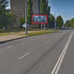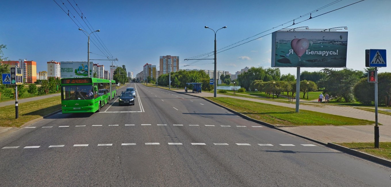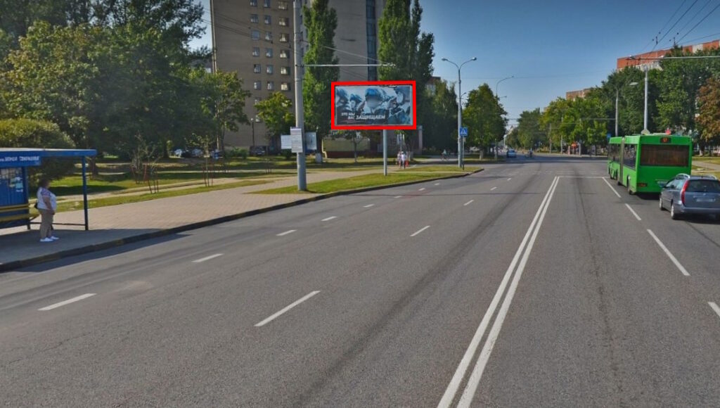 Двусторонний билборд расположен на перекрестке улиц Свиридова и Петруся Бровки. Крупный спальный микрорайон города, много новостроек, оживленное автомобильное движение.