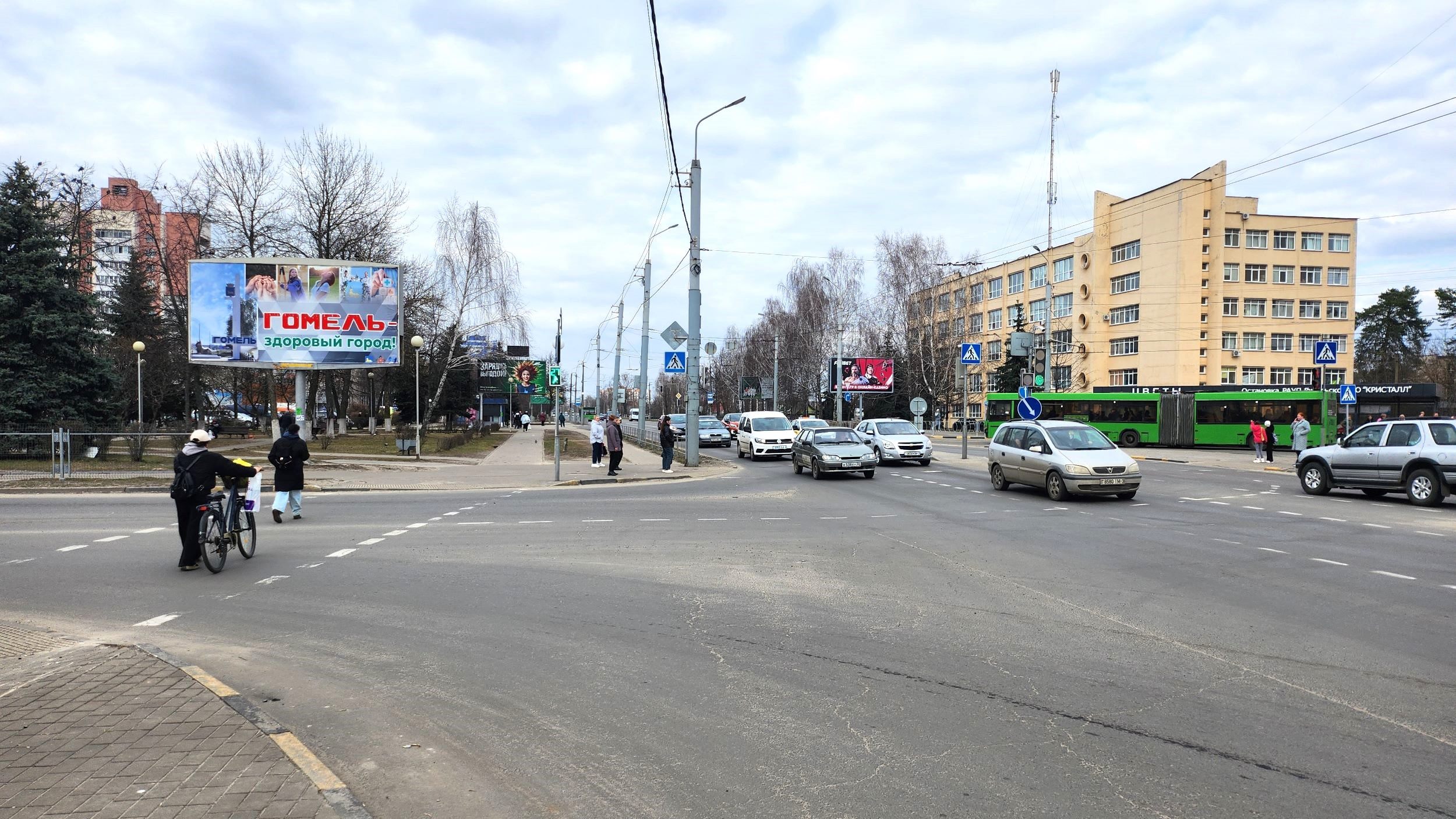 Большой поток пешеходов и автомобилей. Сторона А работает в направлении к Речицкого проспекту.