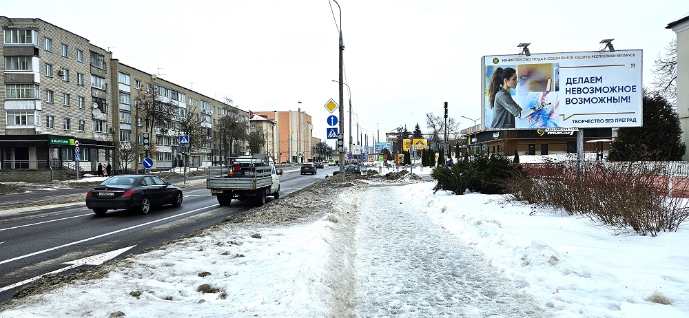 Рекламный щит расположен в центре Гомеля на пересечении ул. Хатаевича и ул. Песина, возле ресторана «МакБАЙ» и «Универмага Гомель» на «Банковской аллее» (Банки: Беларусбанк, Белинвестбанк, БелВЭБ, Технобанк). Круглосуточно интенсивное движение транспорта и пешеходов.