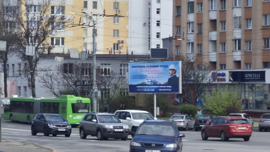 Рекламный щит расположен на “Кузнечном путепроводе”, район “ЗИП”, самый загруженный перекресток Гомеля. Пересечение улиц Барыкина – Фрунзе – Интернациональная. Реклама отлично просматривается транспортом, двигающимся по ул Барыкина и с ул. Фрунзе в любом из направлений.